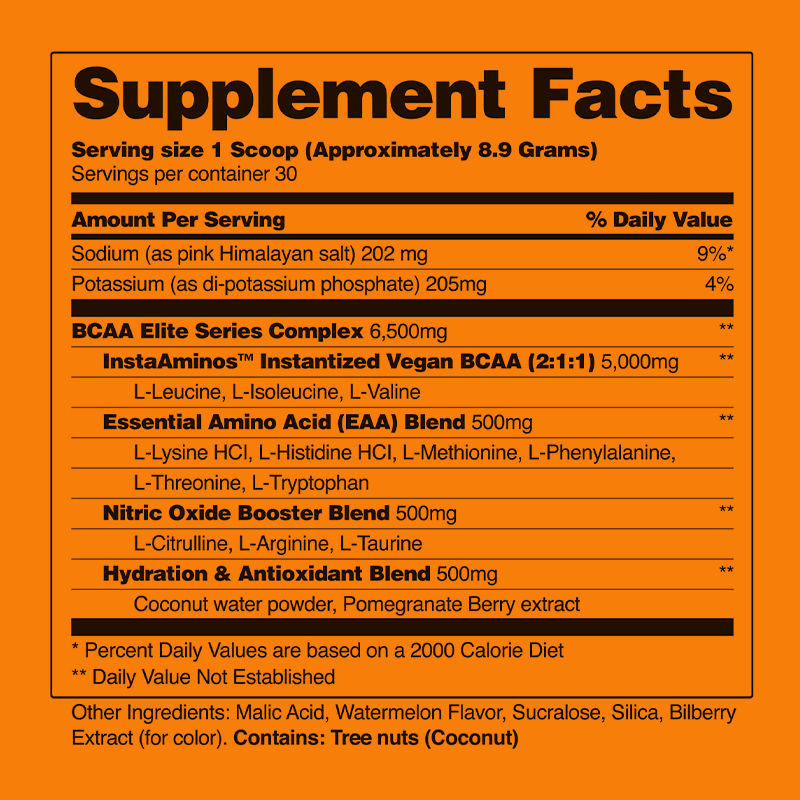 सामग्री: सोडियम, पोटेशियम, बीसीएए एलीट सीरीज कॉम्प्लेक्स, इंस्टेंटाइज्ड वेगन बीसीएए, आवश्यक अमीनो एसिड मिश्रण, नाइट्रिक ऑक्साइड बूस्टर मिश्रण, हाइड्रेशन और एंटीऑक्सीडेंट मिश्रण