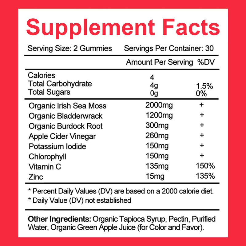 कार्बनिक आयरिश सी मॉस, विटामिन सी, जिंक, कार्बनिक ब्लेडरवार्क, कार्बनिक बर्डॉक रूट, सेब साइडर सिरका, पोटेशियम आयोडाइड, क्लोरोफिल