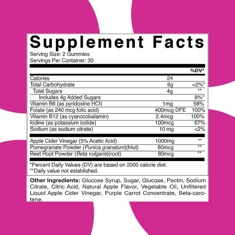 सेब सीडर सिरका, विटामिन बी6, फोलेट, विटामिन बी12, आयोडीन, सोडियम, अनार पाउडर, बीट रूट पाउडर