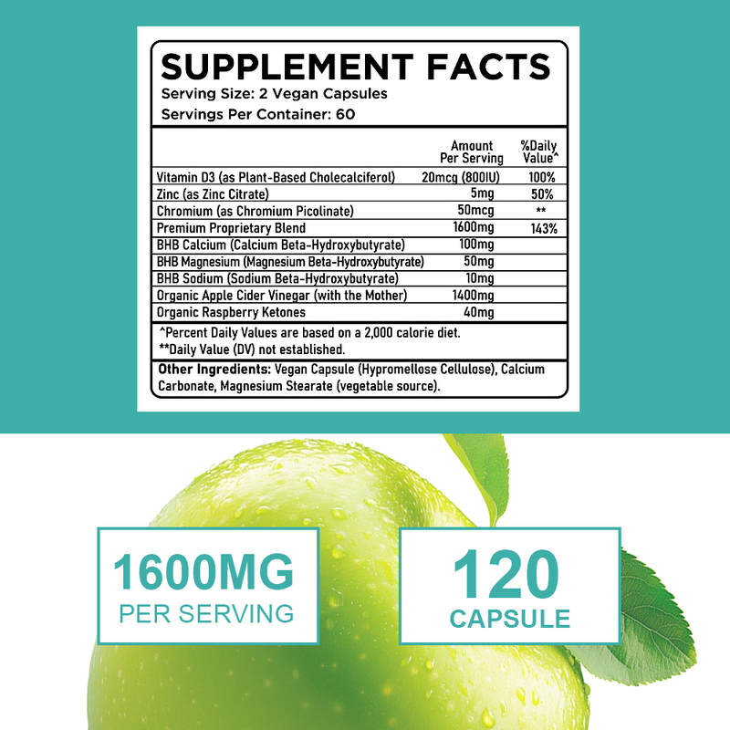 जैविक सेब साइडर सिरका, विटामिन डी3, जिंक, क्रोमियम, प्रीमियम स्वामित्व मिश्रण, बीएचबी कैल्शियम, बीएचबी मैग्नीशियम, बीएचबी सोडियम, जैविक रास्पबेरी केटोन