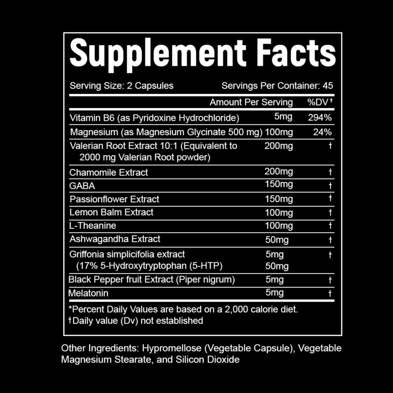 विटामिन बी6, मैग्नीशियम, वैलेरियन रूट एक्सट्रैक्ट, कैमोमाइल एक्सट्रैक्ट, गाबा, पैशनफ्लावर एक्सट्रैक्ट, लेमन बाम एक्सट्रैक्ट, एल-थेनाइन, अश्वगंधा एक्सट्रैक्ट, ग्रिफोनिया सिम्पलिसिफोलिया एक्सट्रैक्ट, ब्लैक पेपर फ्रूट एक्सट्रैक्ट, मेलाटोनिन