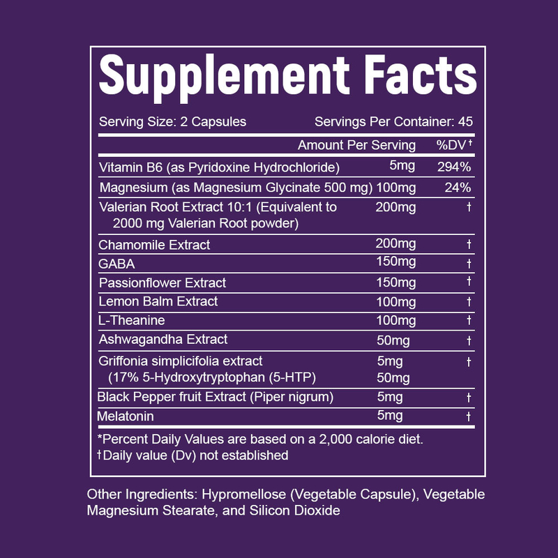 विटामिन बी6, मैग्नीशियम, वैलेरियन रूट एक्सट्रैक्ट, कैमोमाइल एक्सट्रैक्ट, गाबा, पैशनफ्लावर एक्सट्रैक्ट, लेमन बाम एक्सट्रैक्ट, एल-थेनाइन, अश्वगंधा एक्सट्रैक्ट, ग्रिफोनिया सिम्पलिसिफोलिया एक्सट्रैक्ट, ब्लैक पेपर फ्रूट एक्सट्रैक्ट, मेलाटोनिन