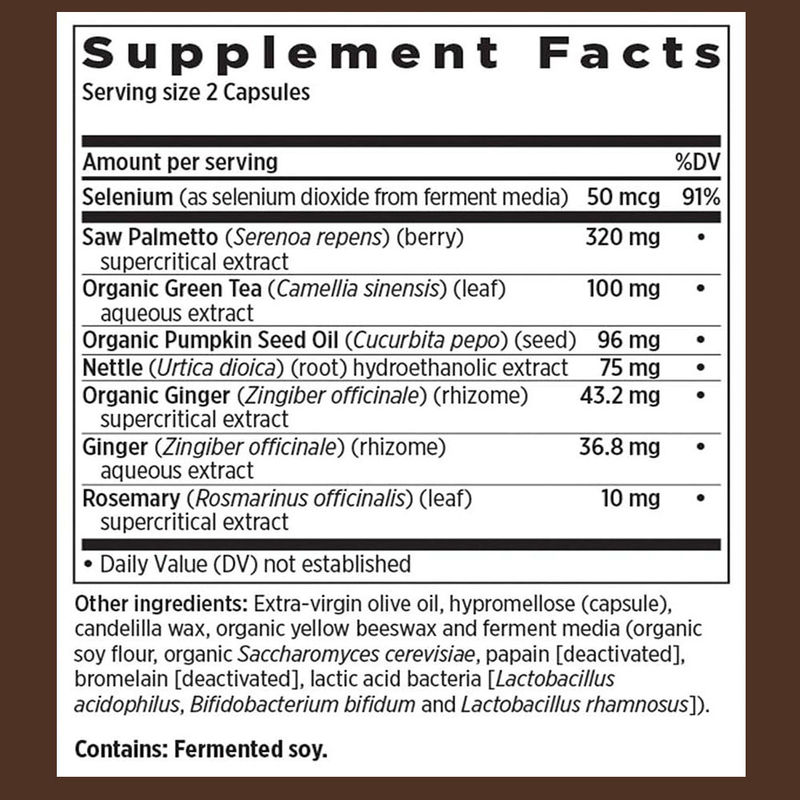 सेलेनियम, सॉ पाल्मेटो, जैविक हरी चाय, जैविक कद्दू बीज तेल, नेटल, जैविक अदरक, अदरक, रोजमरी