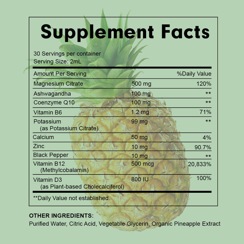 मैग्नीशियम साइट्रेट, अश्वगंधा, कोएंजाइम Q10, विटामिन B6, पोटेशियम, कैल्शियम, जिंक, ब्लैक पेपर, विटामिन B12, विटामिन D3